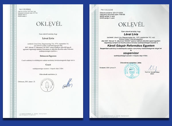 Elvégeztem a Debreceni Egyetem coach-képzését, 2024-ben pedig szupervizori diplomát szereztem a Károli Gáspár Református Egyetemen.